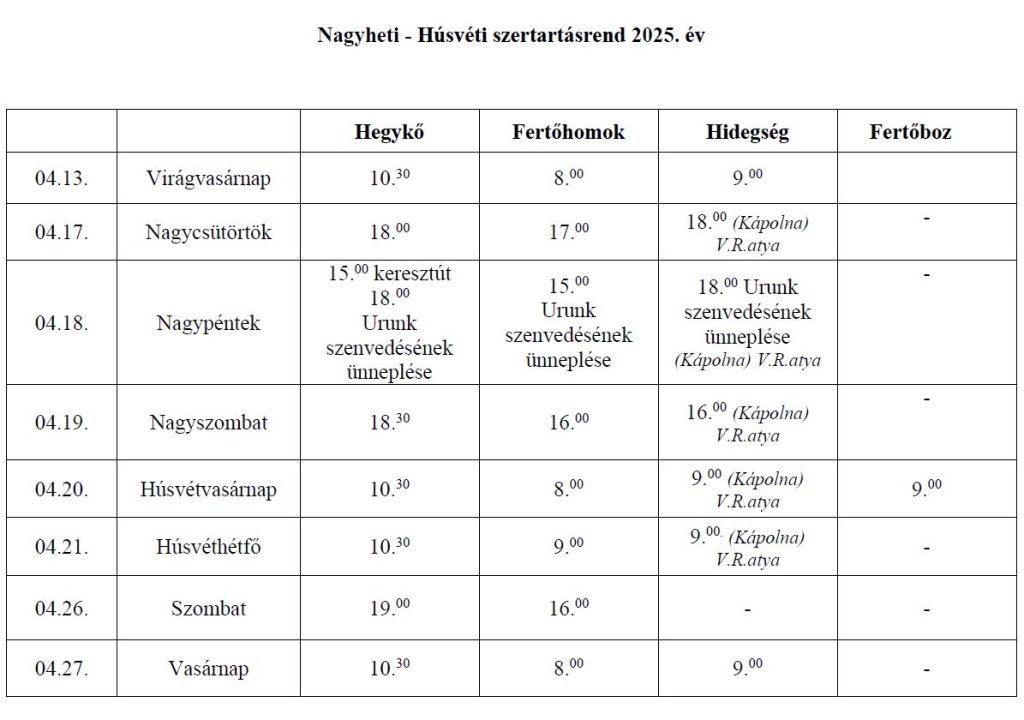 Vasárnaponként ezentúl Hidegségen mindig 8 órakor, Fertőhomokon 9 órakor, Hegykőn 10.30 órakor kezdődik a szentmise.